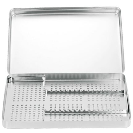 Portastrumenti inox completo di vassoio forato, coperchio non forato e griglia per 16 strumenti, 28,8×18,7×3,9 cm. Asa