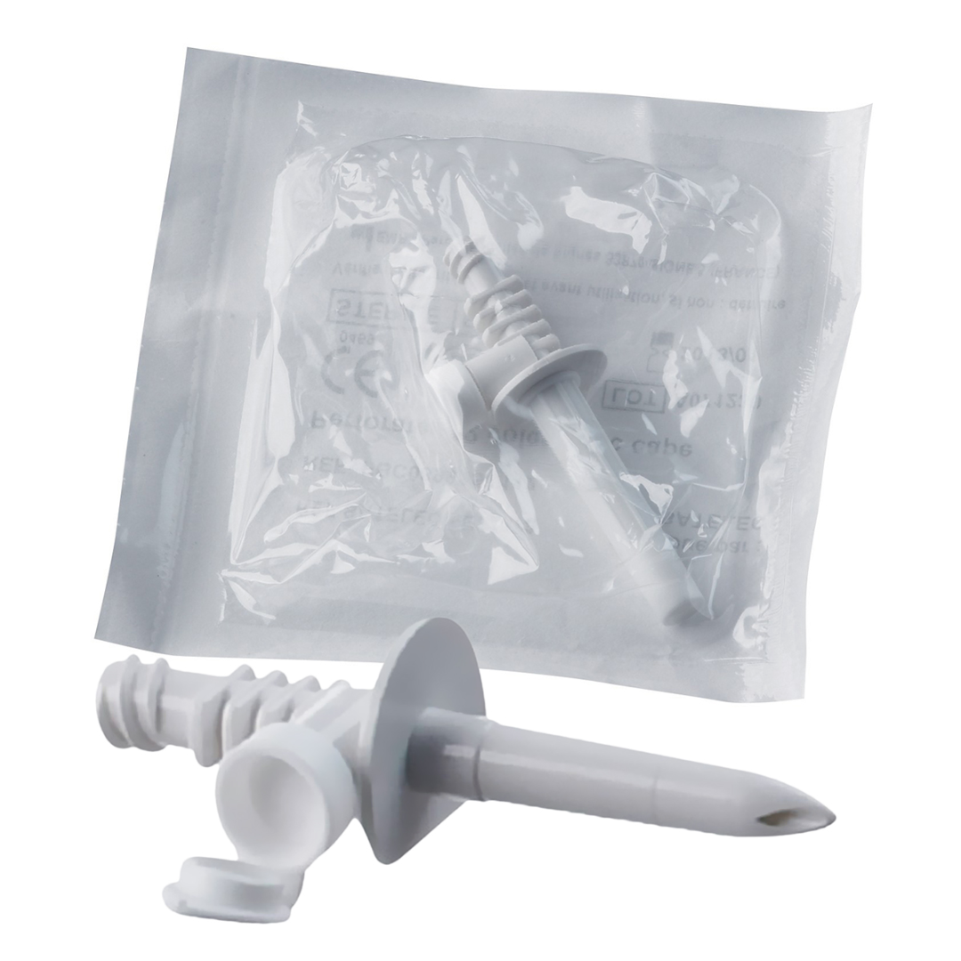 Perforatore ad Alta Precisione: Il puntale perforatore è studiato per penetrare con facilità i tappi delle sacche di soluzione fisiologica, garantendo una tenuta perfetta senza perdite di liquido.