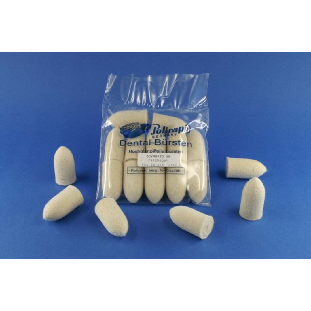 Progettato per essere montato su mandrini da banco o manipoli rotanti, questo cono in feltro di alta qualità permette di ottenere superfici perfettamente brillanti su metalli preziosi, leghe dentali e resine acriliche.