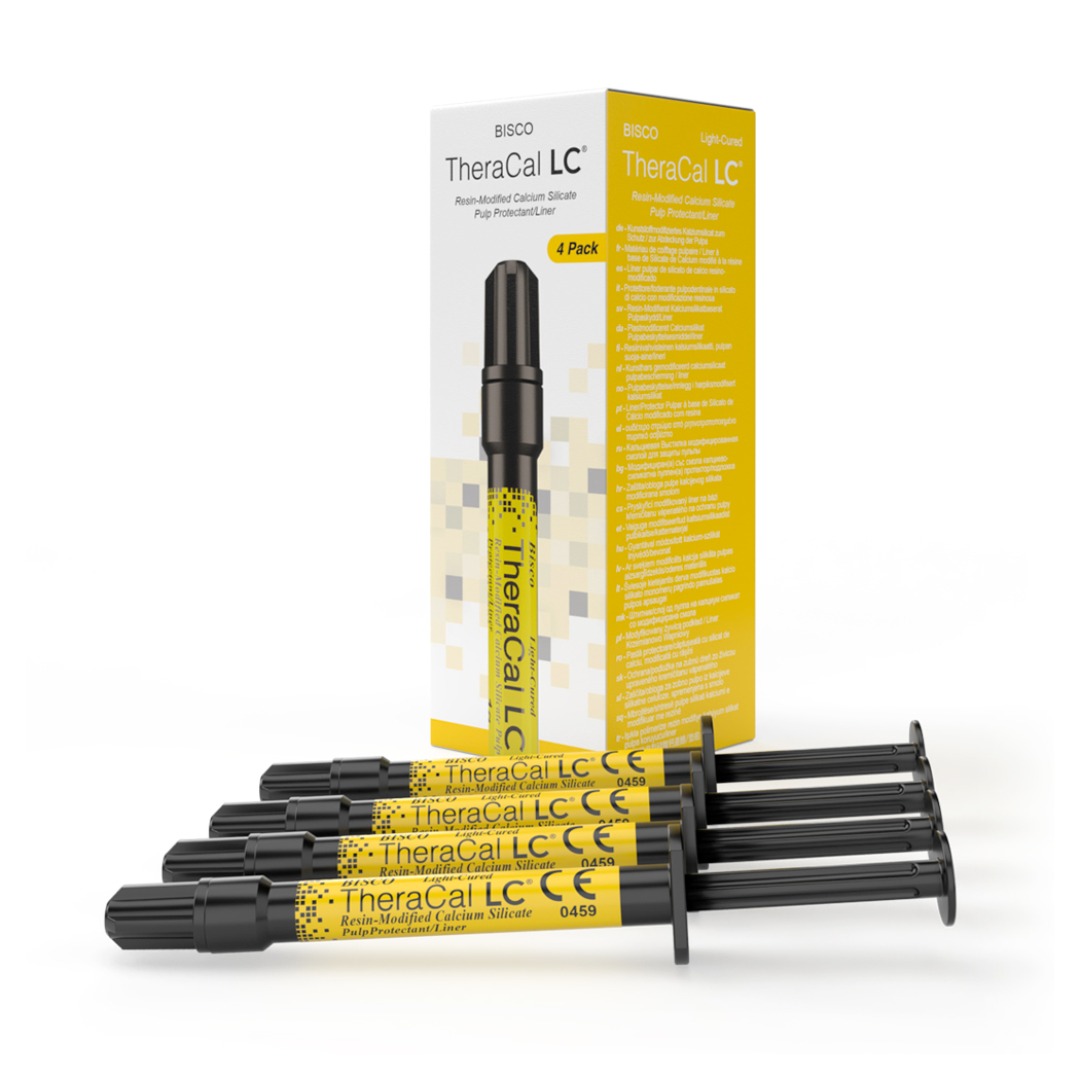 THERACAL LC 4 siringhe da 1 grammo, Protettore Pulpodentinale, TCAL BiscoTheracal™ LC è un liner fotopolimerizzabile radiopaco in silicato di Calcio rinforzato con resina:Ideato per fungere da barriera protettiva per il complesso pulpodentinale (trattamenti diretti e indiretti), sotto a composito, cemento, amalgama e altri materiali; Altamente radiopaco (2.63 mm Al);Con un significativo rilascio di Calcio (pari a 188.g/cm2) che, unitamente al pH alcalino, stimola la formazione di dentina di reazione, dell’idrossiapatite e del ponte dentinale in incappucciamenti diretti.