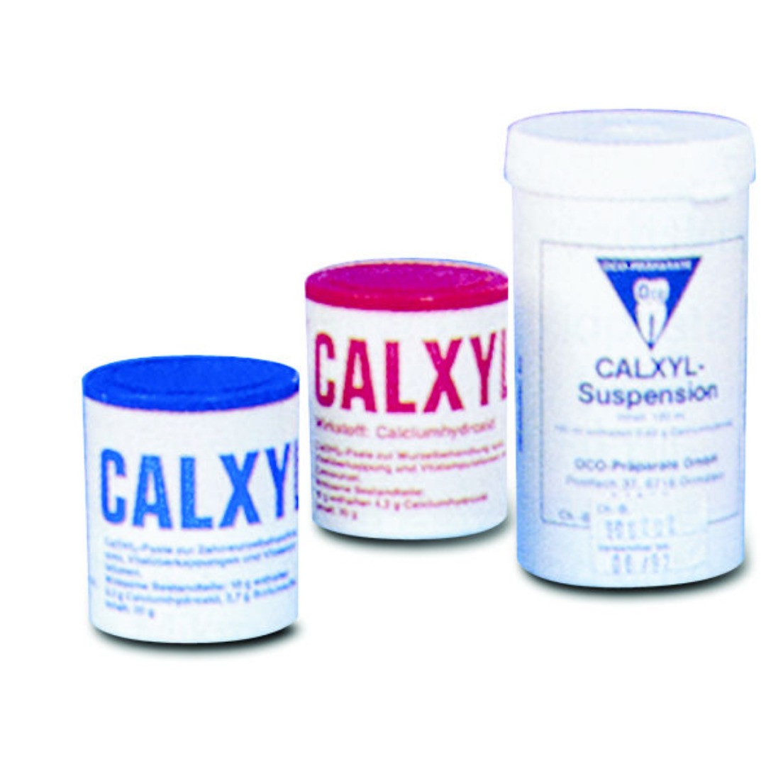 Il Calxyl® è una sospensione acquosa di idrossido di calcio per il riempimento temporaneo dei canali radicolari e per l’incappucciamento diretto o indiretto della polpa (trattamento di carie profonde). Grazie al suo elevato valore pH (> 12,6) ha un’azione batteriostatica che funge da protezione contro una reinfezione. Il Calxyl® stimola la formazione di dentina terziaria (bridging) e, grazie al sigillo dei tubuli dentinali, svolge una funzione desensibilizzante. Si crea una barriera nei confronti del cemento dentale per evitare l’esposizione ad ambiente acido. Versione in siringa, pasta radiopaca.