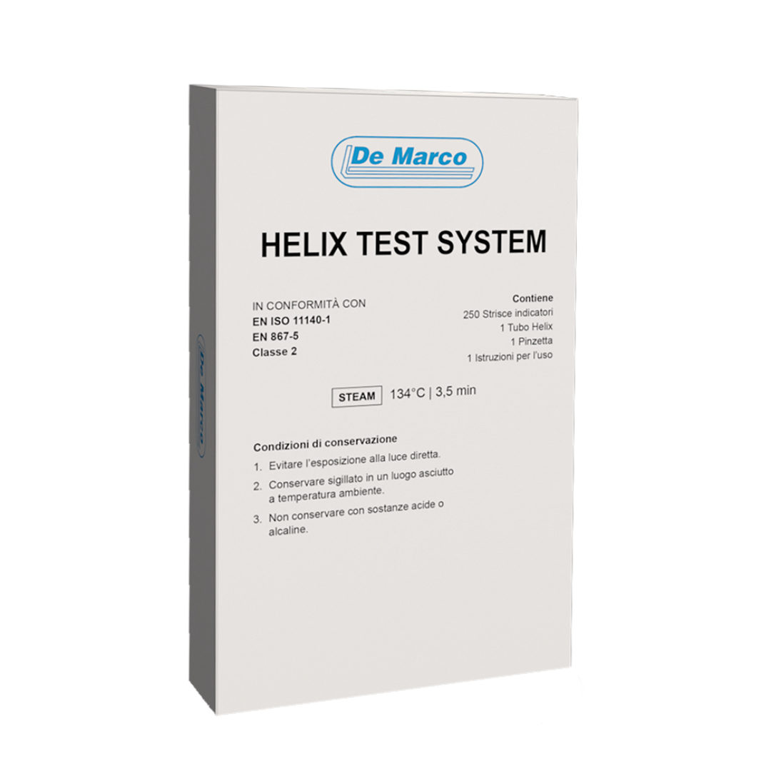 Helix Test De Marco è un test professionale per il controllo della sterilizzazione in autoclave, specificamente progettato per la verifica di un’adeguata penetrazione del vapore. Ideale per il monitoraggio dei processi di sterilizzazione in corpi cavi, come siringhe, cannule, turbine e tubi di dispositivi medici, strumenti chirurgici e attrezzature odontoiatriche.