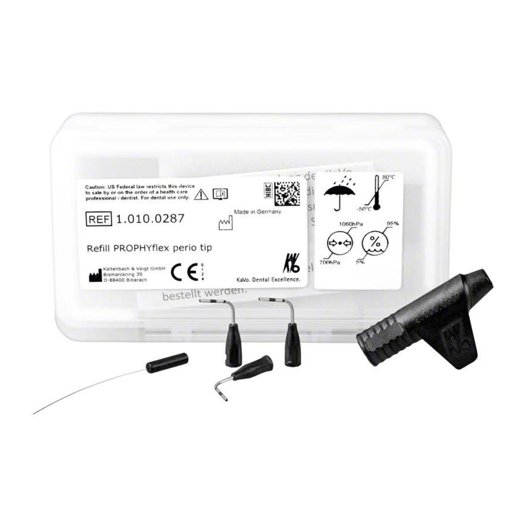 PROPHYflex Perio Tip con cannula piccola e precisa per un trattamento subgengivale mirato e delicato, nonché per la pulizia di ponti, impianti e corone. Cod. 1.010.0287 Kavo.