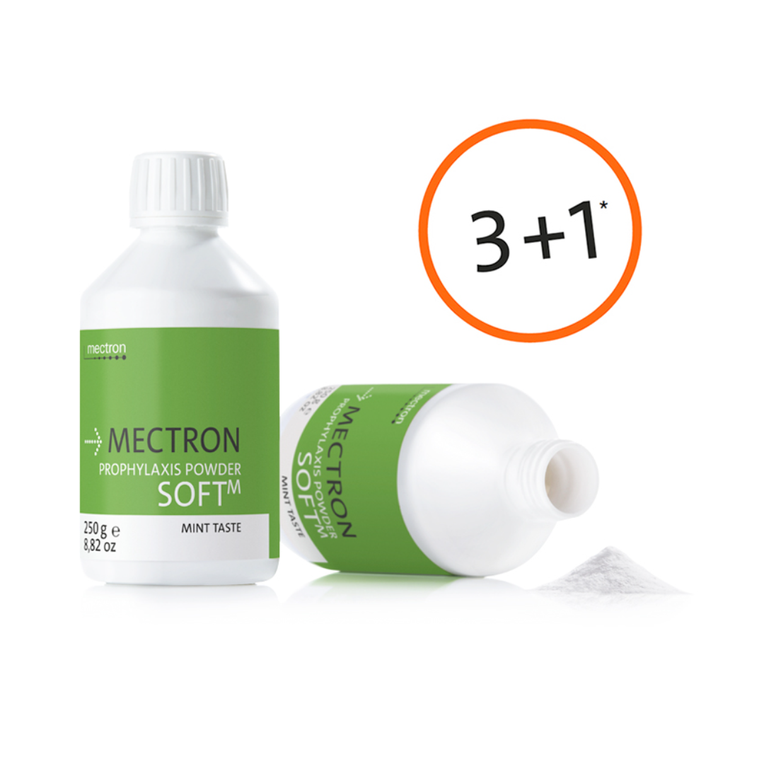 Il kit in formato convenienza da 4 flaconi da 250g è lo standard per i professionisti che utilizzano sistemi di air-polishing (come il celebre Mectron Combi o Starjet) e cercano un prodotto affidabile per l’igiene quotidiana.