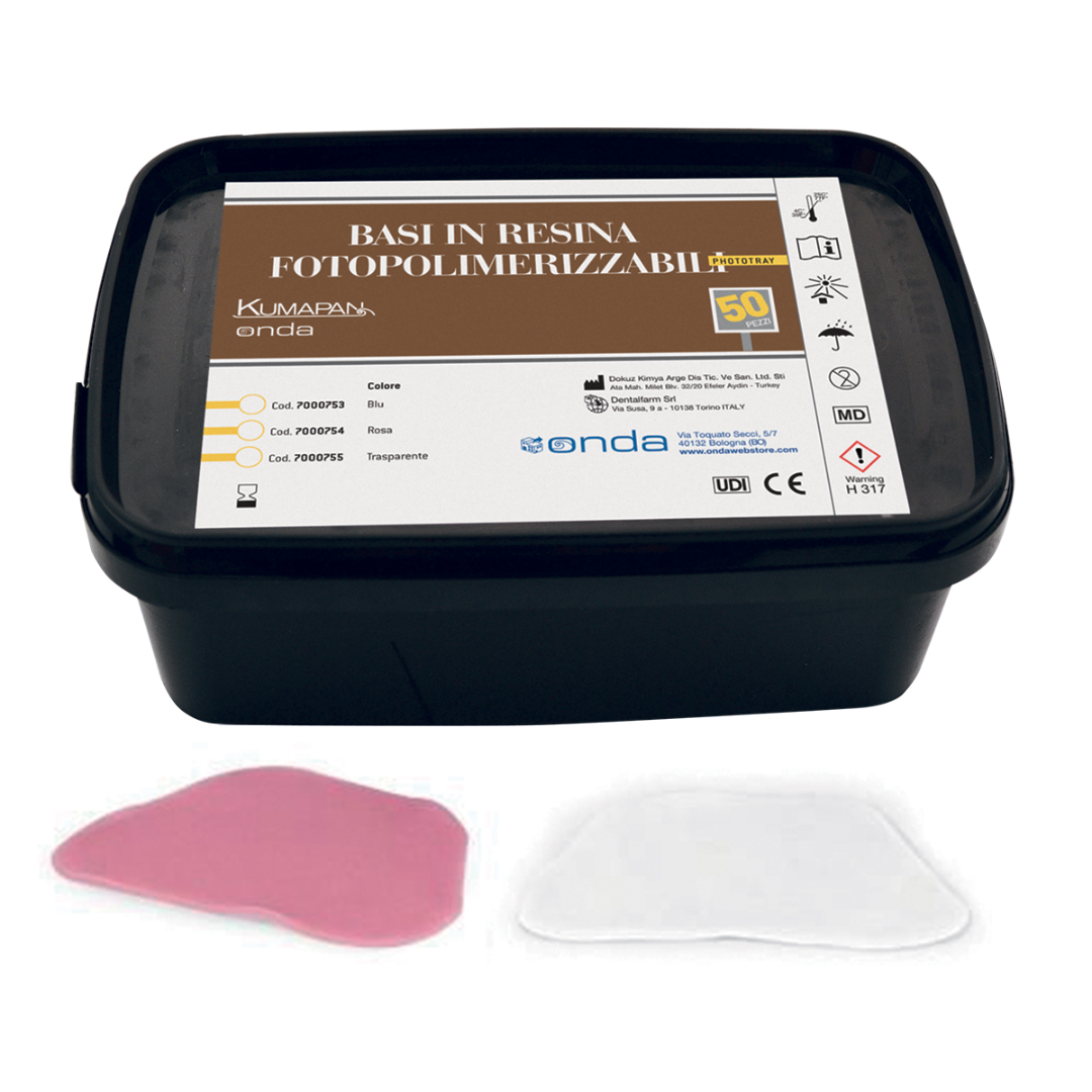 Resina fotosensibile in placche per la realizzazione di porta impronte individuali o parziali, basi per dentiere, masticoni di prova, blocchi occlusali e mascherine di fissaggio.
