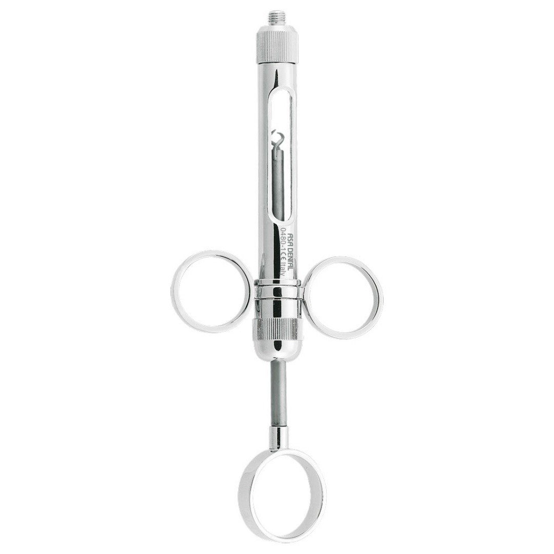 Siringa per anestesia a 3 anelli con aspirazione e aggancio tubofiala a doppio uncino fig. 1 KumapanSiringa a tre anelli in ottone cromato per anestesia, con terminale filettato resistente ai liquidi per disinfezione a freddo, sterilizzabile in autoclave.