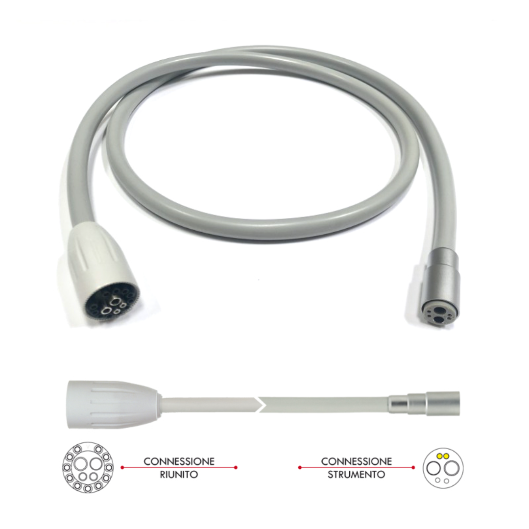 Il cordone TKD per turbina con fibra ottica è un componente di ricambio professionale progettato per l’integrazione sui riuniti del gruppo Cefla (Anthos, Castellini, Stern Weber). Dotato di attacco universale a 4 vie (Midwest) e contatti elettrici per l’illuminazione, questo cordone garantisce la massima efficienza dei manipoli a turbina, assicurando un passaggio fluido di aria, acqua e segnale luminoso.