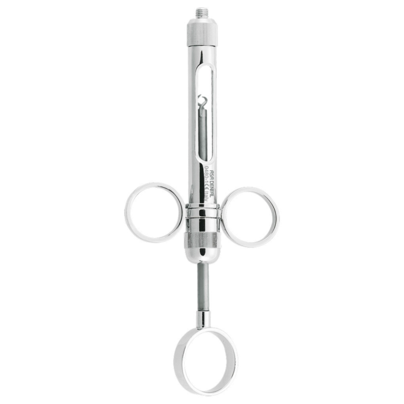Siringa professionale in acciaio inox di alta qualità, caratterizzata dall'impugnatura a tre anelli per una gestione superiore della manovra di aspirazione e dell'iniezione.