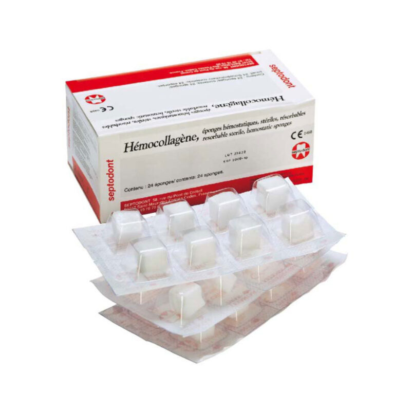 Hemocollagene è un dispositivo medico di Classe III composto da spugne di collagene bovino liofilizzato, progettato per l'emostasi rapida e la protezione degli alveoli dopo l'estrazione dentale.